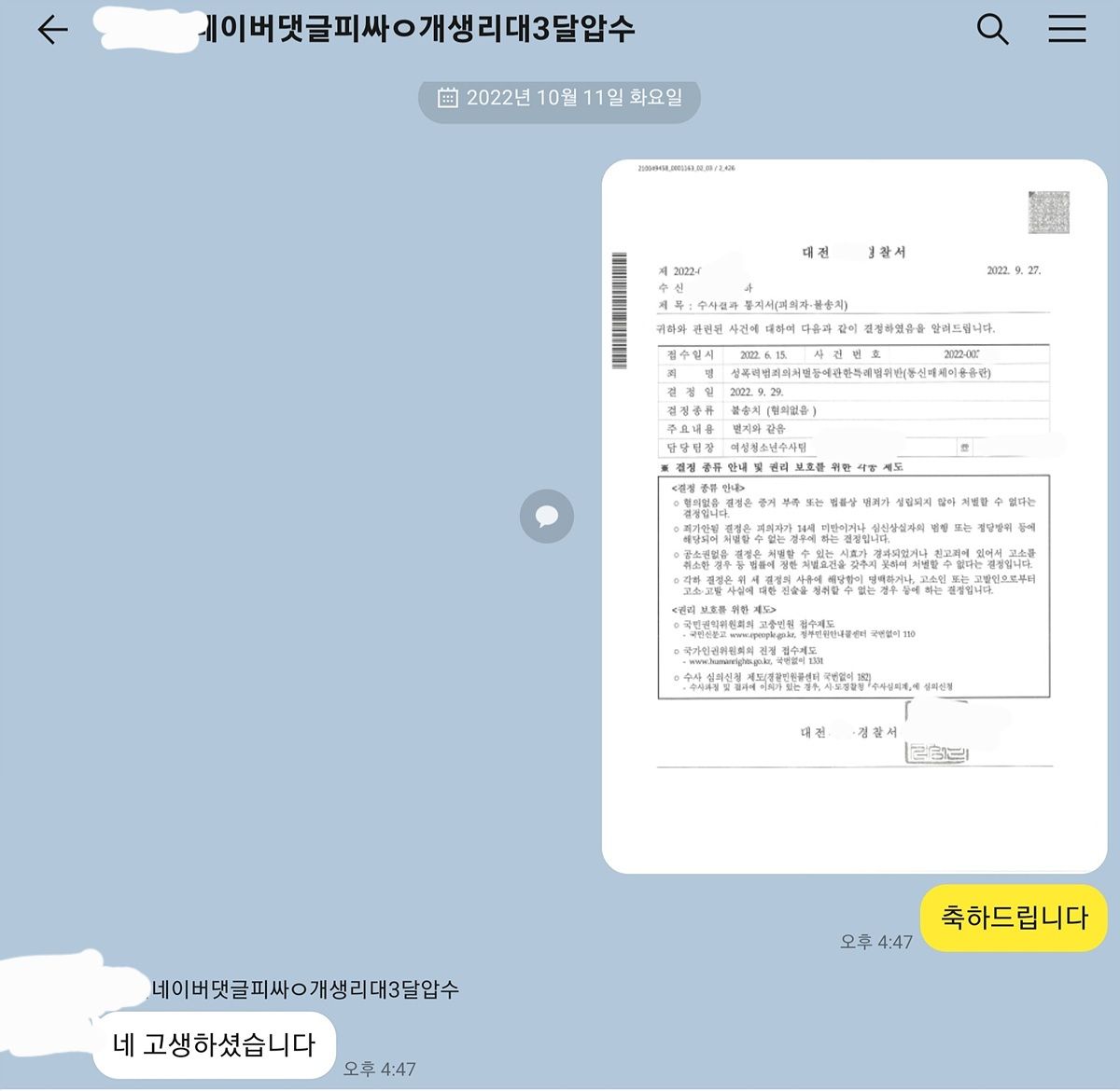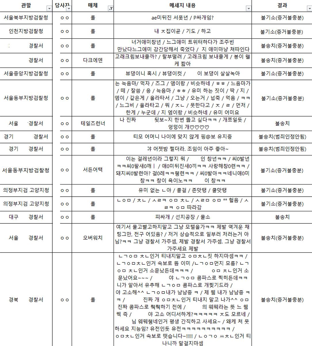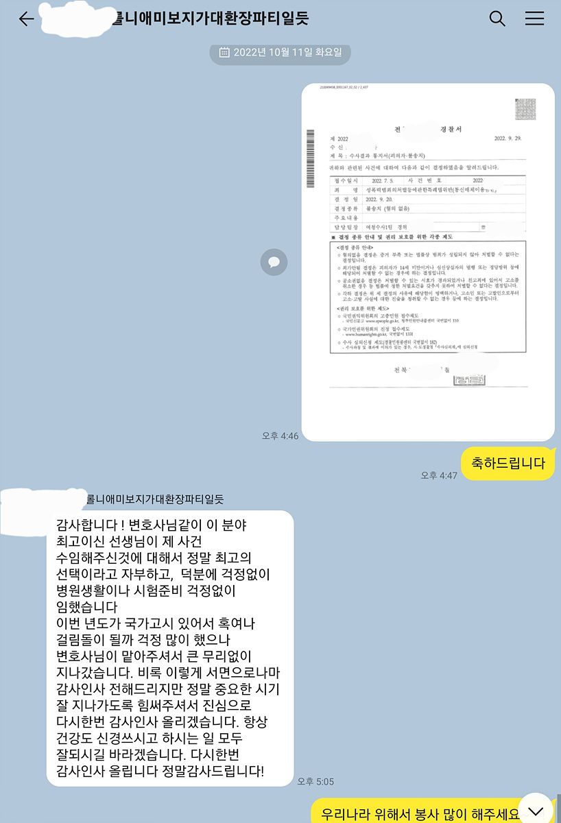 창녀, 보지라는 표현이 들어간 채팅에 대하여 무혐의로 종결시킨 사례가 16건이 있었고 이러한 내용이 당연히 첨부된, 충실히 작성한 의견서를 조사 전에 미리 제출하였습니다. 조사는 간단히 마무리될 수 있었고 의뢰인에게 기쁜 소식을 전달할 수 있었습니다.