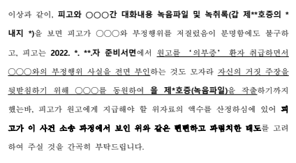 또한, 본 변호사는, 상간녀의 기존 행태로 미루어 볼 때 결정적인 증거가 제출되기 전까지는 상간녀가 부정행위 사실을 뻔뻔하게 부인할 것이라는 판단 하에, 소장 제출 시에는 결정적인 증거인 모텔 출입 관련 녹음파일 및 녹취록은 제출하지 않고 상간녀와 의뢰인의 배우자가 팔짱을 끼고 길거리를 걷고 있는 사진만을 제출하였고, 아니나 다를까 상간녀는 의뢰인의 배우자까지 동원하여 의뢰인을 의부증 환자로 몰아가는 내용의 통화내용 녹취록까지 작출해서 제출하면서 '의뢰인의 배우자와는 친구 사이일 뿐이며 의뢰인의 배우자가 술에 많이 취해서 부축을 하느라 잠시 팔짱을 낀 것'이라며 부정행위 사실을 뻔뻔하게 부인하는 내용의 답변서를 제출하였습니다. 이와 같이, 상간녀가 허위의 증거와 답변서를 제출하자마자, 본 변호사는 결정적인 증거인 모텔 출입에 관한 녹음파일 및 녹취록을 제출하면서 재판부께 '위자료의 액수를 산정하심에 있어 상간녀가 이 사건 소송 과정에서 보인 뻔뻔하고 파렴치한 태도 또한 고려하여 주실 것'을 부탁드렸습니다.