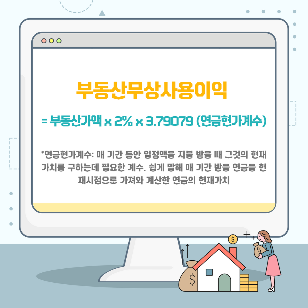 그러나 현재와 5년 뒤의 돈의 가치는 다르기 때문에 5년간 증여 이익을 10% 이자율로 할인 평가하여 계산합니다. 따라서 부동산 무상사용 이익은 아래와 같이 1년 치 이익에 연금 현가 계수를 곱하여 산정합니다.
