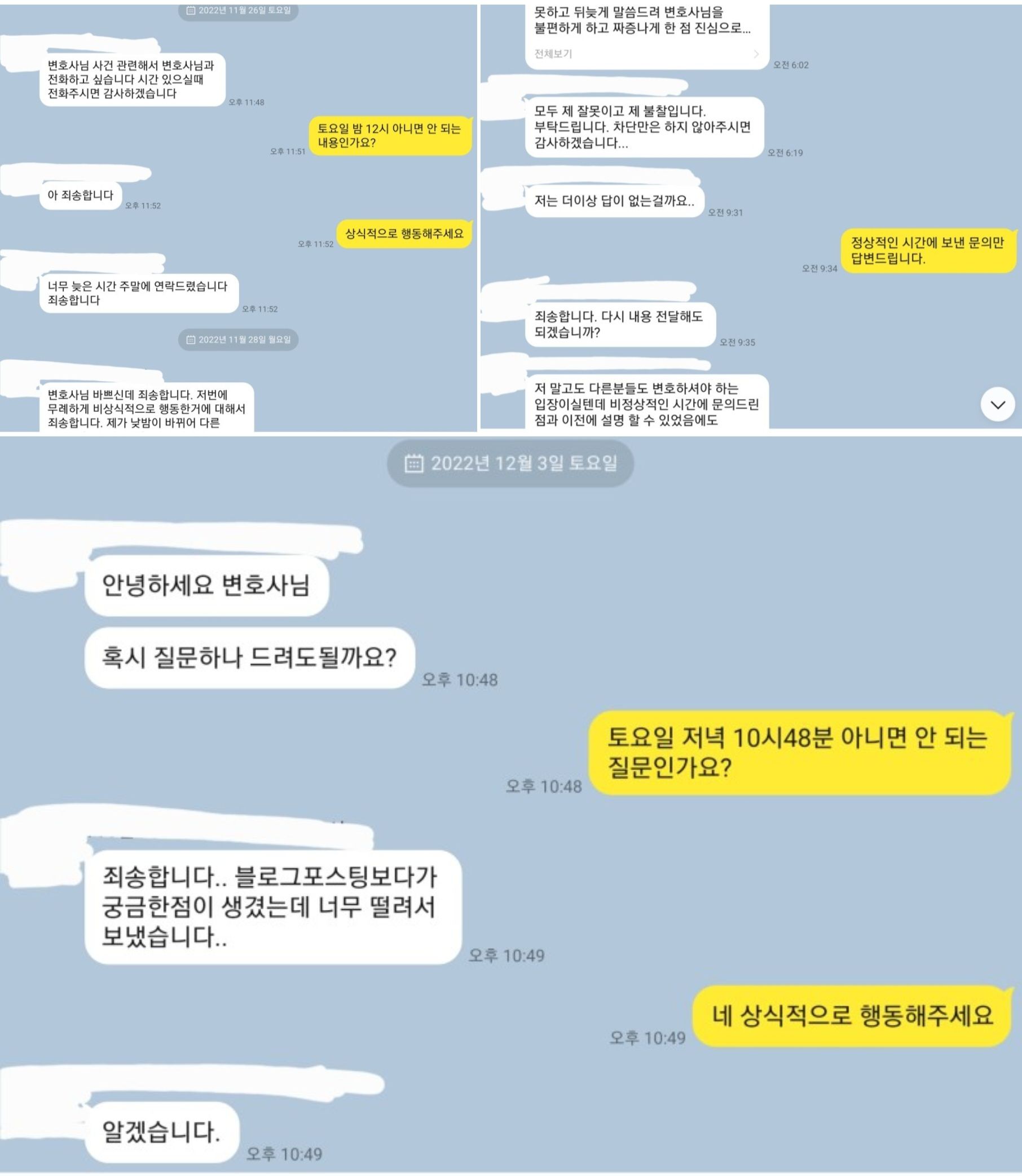이미 선임하여 계약관계로 맺어진 의뢰인의 경우 이런 상황에서 상식적으로 행동해줄 것을 요청하나, 의뢰인도 아닌 사람인데 밤 12시에 연락하는 놈들도 있는데 바로 차단하고 있습니다. 세상에는 별의별 놈들이 많다는 생각이 듭니다. 물론 심야 그 시각에 즉시 연락이 되어야만 하는 상황이라면 당연히 연락을 받고 저 역시 이를 위하여 무음으로 해두지 않고 있습니다. 새벽에 모텔에서 또는 집에서 자다가 억울하게 강간죄, 준강간죄로 신고당하여 현행범으로 체포되거나 긴급체포, 임의동행되는 경우가 있습니다. 이러한 상황이라면 당연히 제 수면보다 적절한 조력을 우선하고 있습니다.