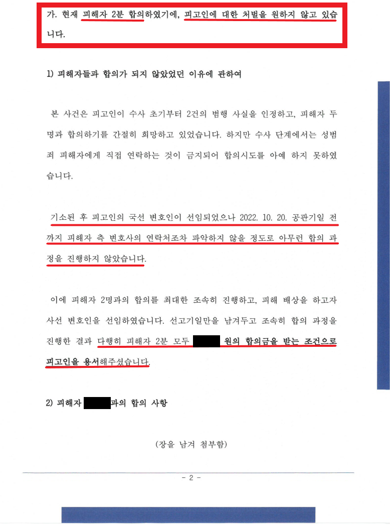① 현재 피해자 2분 합의하였기에, 피고인에 대한 처벌을 원하지 않고 있음.