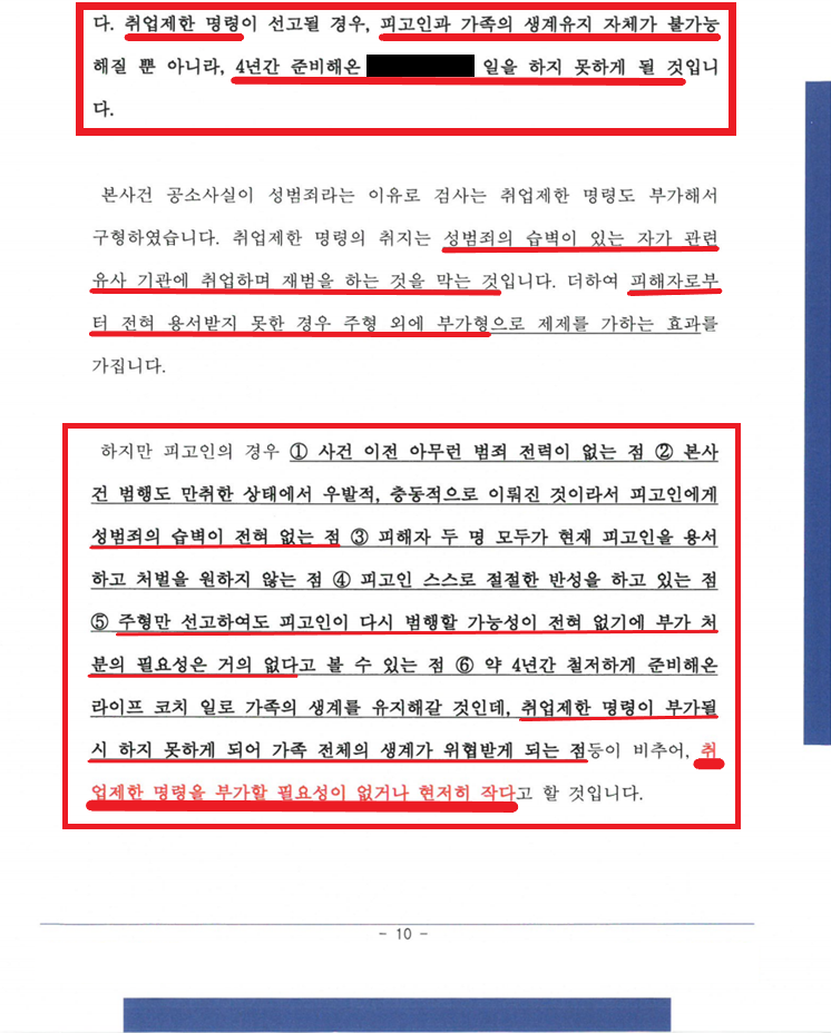 재판부는 의견서 내용을 모두 받아들여 실형 대신 집행유예를 선고하고, 검사가 청구한 취업제한명령은 받아들이지 않았습니다.