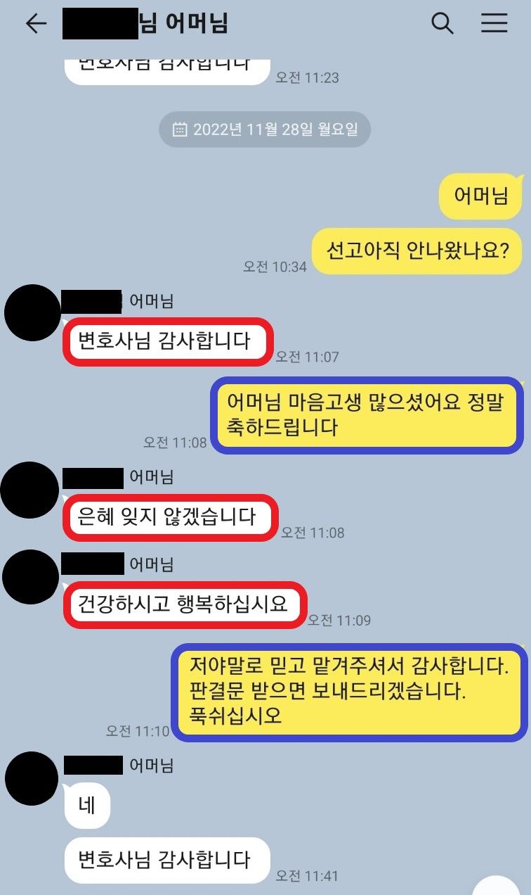 선고기일만을 앞둔 상태에서 선임되어, 재판 기록을 열람등사하고, 두 피해자측에게 연락을 시도하여 합의를 진행하고, 의견서를 내야하는데 시간이 매우 촉박했습니다.