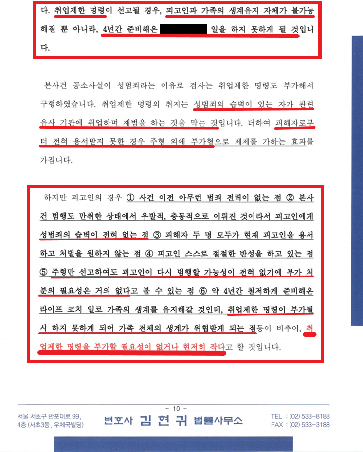 재판부로부터 선처를 받아 집행유예를 받는 것이 1차 목표이지만, 2차적으로는 취업제한명령을 부과받지 않는 것도 중요합니다. 검사는 A의 죄질이 매우 불량하다고 보아 5년의 취업제한 명령을 부과하였으나, 최대한 참작 사유를 어필하여 해당 명령도 선고받지 않는 것을 목표로 하였습니다.