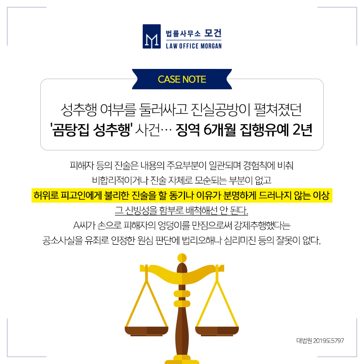 이처럼 강제추행 사건은 CCTV나 주변인들의 진술 등 명확한 증거가 없어도 피해자의 진술의 신빙성 만으로도 형사처벌이 이루어질 수 있습니다. 공기업이나 많은 기업에서도 금고형 이상의 실형을 선고받을 경우 인사상 불이익을 주고 있으며, 성범죄자라는 범죄전력은 여러 불이익이 뒤따르게 될 수 있으므로 성범죄전문변호사의 긴밀한 조력을 받아 해결하는 것이 바람직합니다.