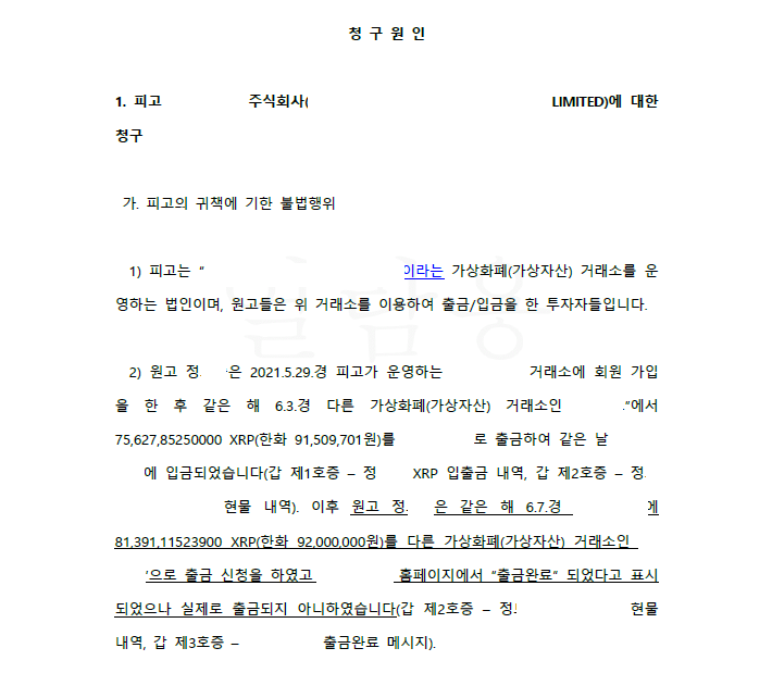 저는 즉각 대한민국 법원에 외국 거래소 및 설립자인 국내 거래소 모두를 피고로 하여 불법행위 손해배상청구소송을 제기하였고 한편으로 위 두 피고들에게 내용증명을 보내어 조속한 문제해결(출금)을 요구하였습니다.