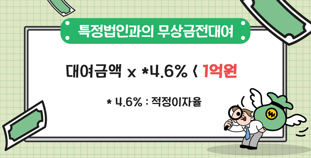 즉, 약 21억 7천3백만 원 정도까지는 특정 법인에 무상으로 대출해줘도 증여세 과세대상에 해당하지 않습니다.
