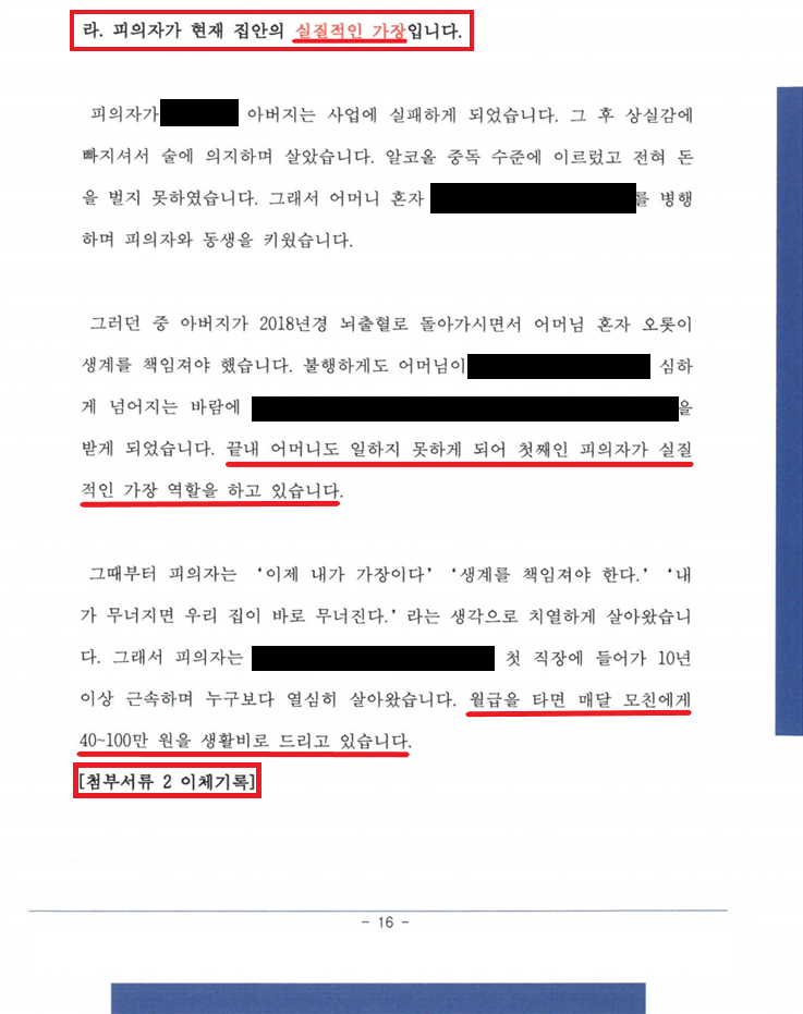 ④ 피의자가 현재 집안의 실질적인 가장임.