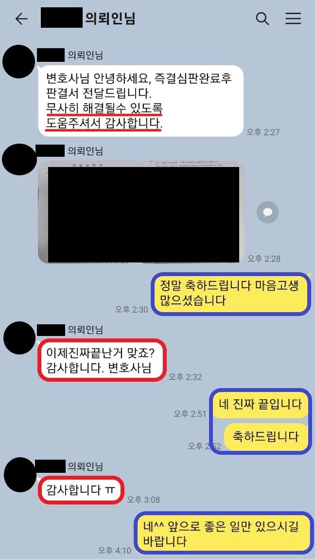 매회 경찰 조사 시 동석하여 진술 조력을 하였습니다. 특히나 담당 형사님에게 피의자의 딱한 사정을 계속 알려드리고, 송치 후 기소유예가 아닌, 송치 전 즉결심판을 청구해줄 것을 간곡히 호소하였습니다.