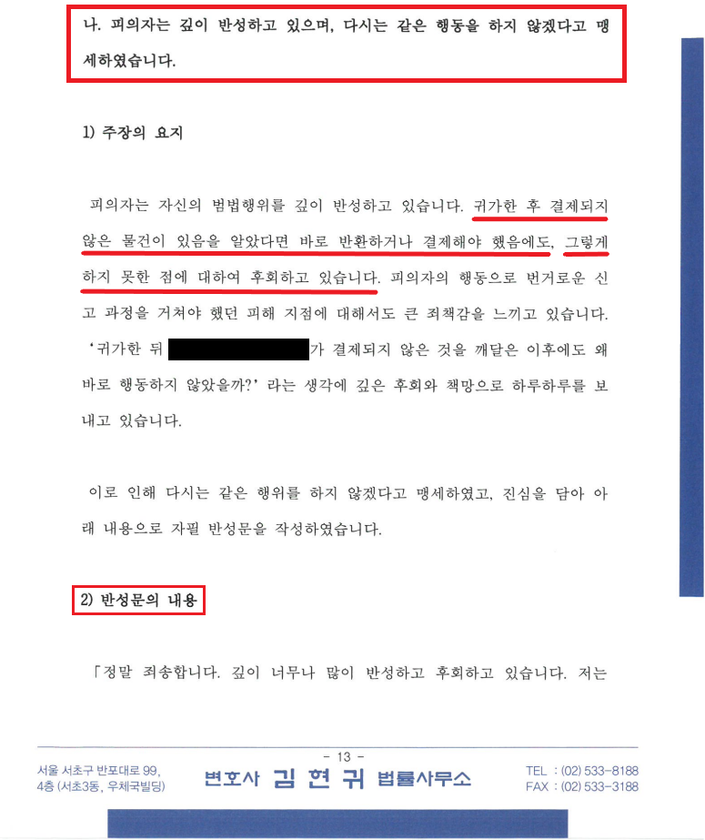 ⑦ 피해 지점이 허락한다면, 변호인을 통하여 경찰 조사 전⦁후를 불문하고 조속히 사과와 배상을 진행할 것임.