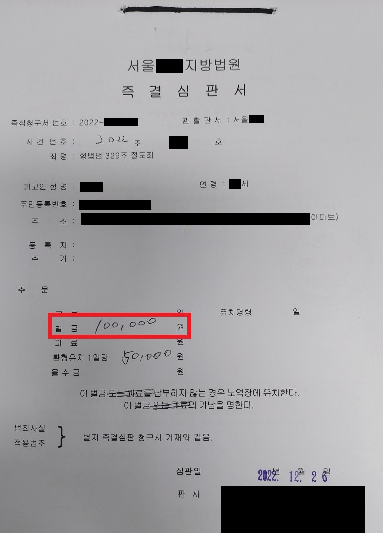 매우 다행히도 담당 수사관이 의견서에 기재된 참작 사유를 잘 헤아려주셔서. 송치되지 않고 즉결심판으로 넘어갔습니다. (경찰서 내 경미범죄심사위원회에 회부된 후, 다시 즉결심판 법원으로 넘어감) 피고인이 즉심 법원에 간 결과 벌금 10만원으로 종결되었습니다.