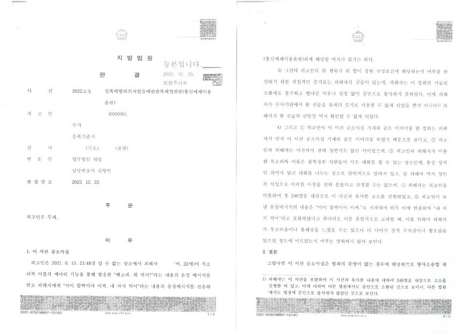 그럼에도 불구하고 이미 약식기소된 사례에 대하여는 유죄판결이 선고된 사례들이 많으며 통매음 계에서는 널리 알려진 안산지원에서도 목소리톡 메아리 사건임에도 불구하고 유죄판결이 선고되기도 하였습니다. 다만 안산지원의 해당 판사님은 내년 2월에 인사이동 예정이라 예전과는 달라질 것으로 예상됩니다.