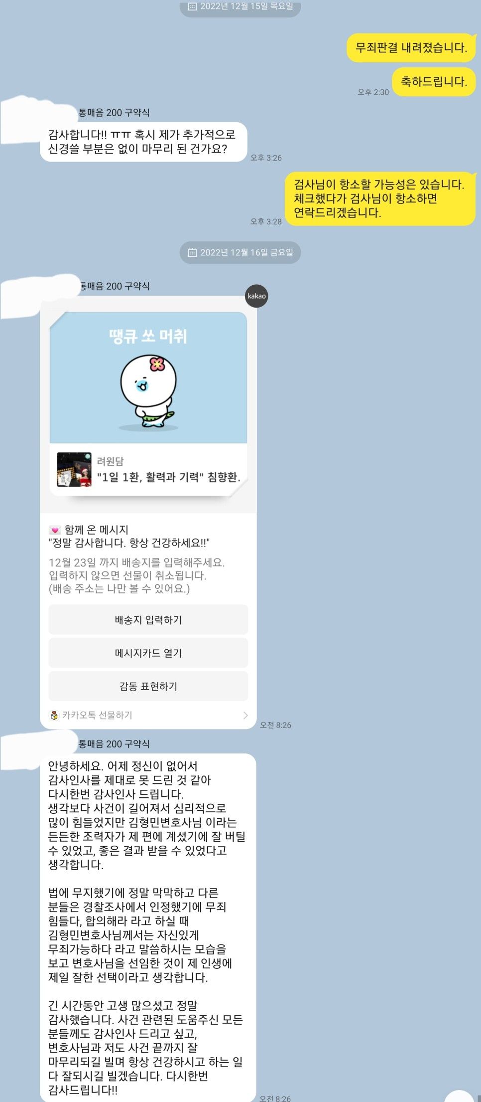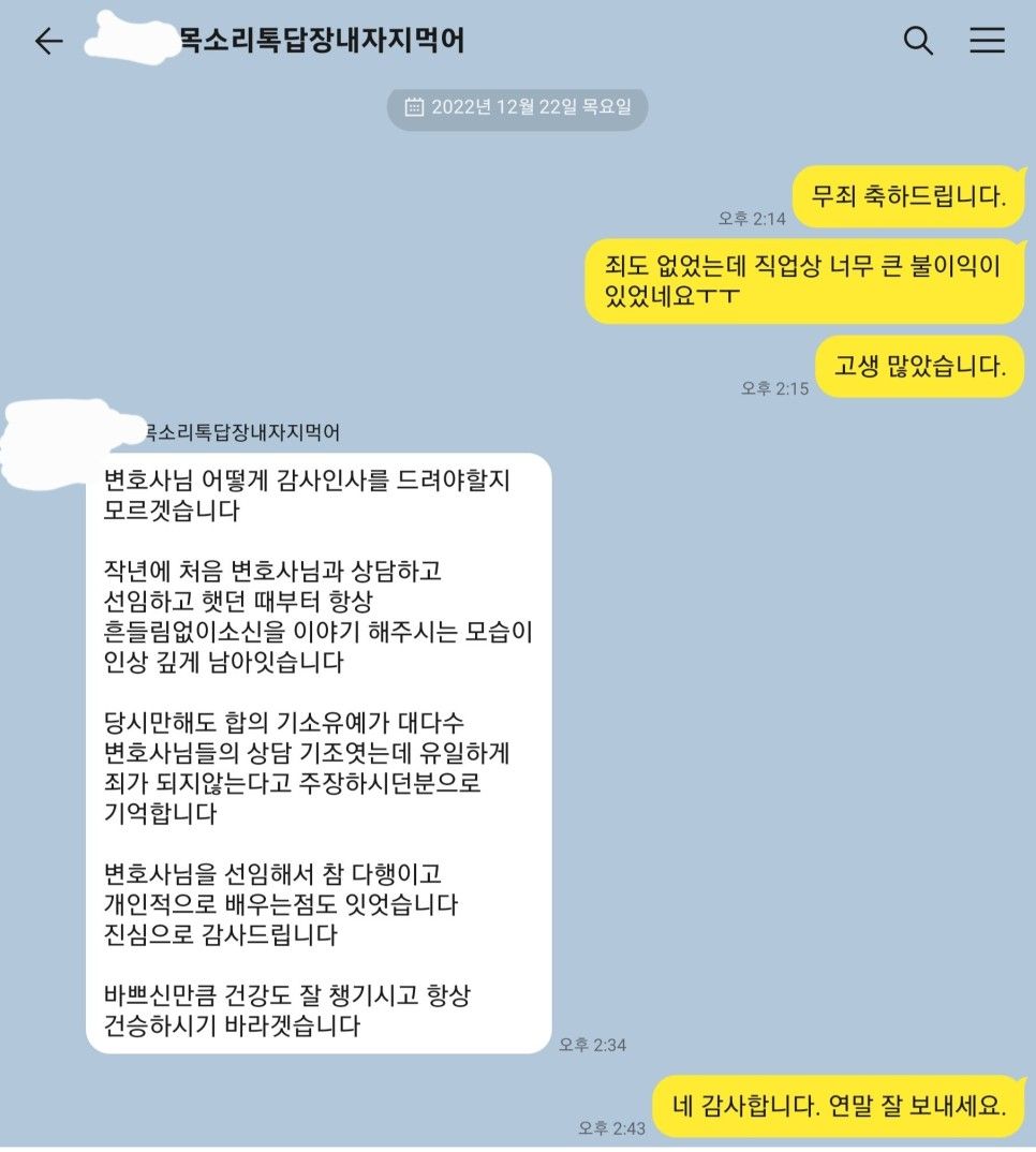 결국 피고인신문을 거쳐 무죄판결을 받아낼 수 있었는데 무죄판결이 선고되었다고 하더라도 긴 시간 의뢰인이 신분상 불이익을 입은 것에 대하여는 안타까운 마음을 금할 수 없습니다.