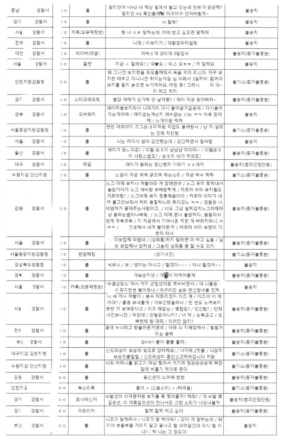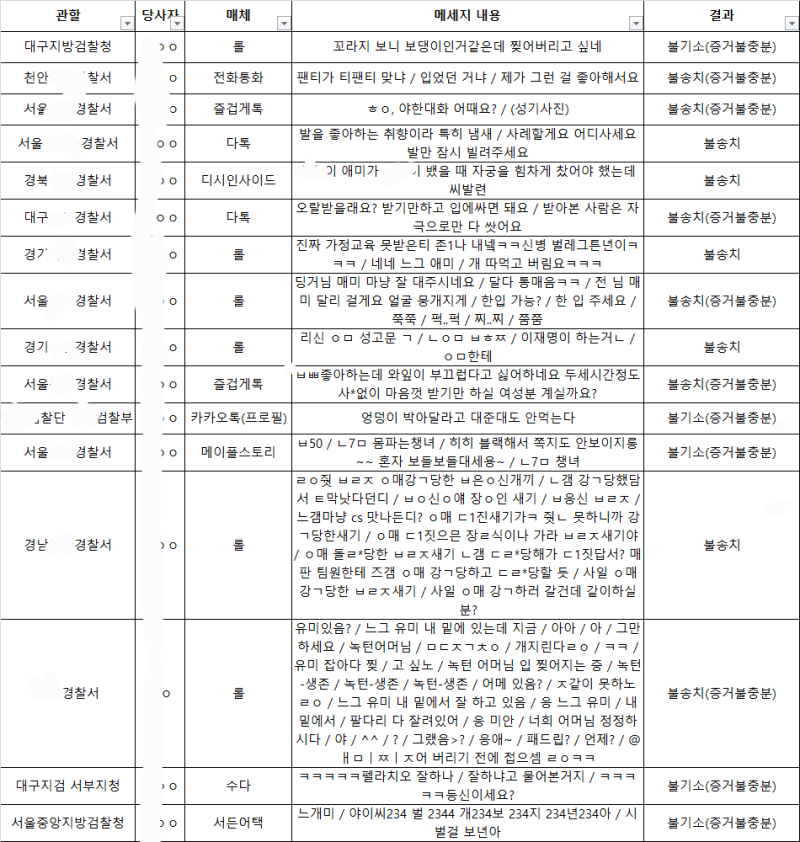 통매음에 대하여 정보제공을 위해 혐의없음으로 종결된 건들에 대하여 표로 정리하여 포스팅하여 왔습니다.
