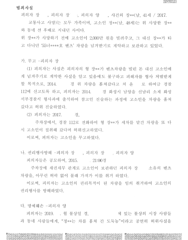 의뢰인의 아들은 아무런 동의/허락 없이 의뢰인 소유 차량을 담보로 맡기고 고소인에게 돈을 빌렸습니다. 의뢰인은 자신의 차량이 주차장에 주차되어 있는 것을 보고 차량을 가져왔는데 고소인은 의뢰인들을 권리행사방해, 무고, 명예훼손으로 고소하였습니다.