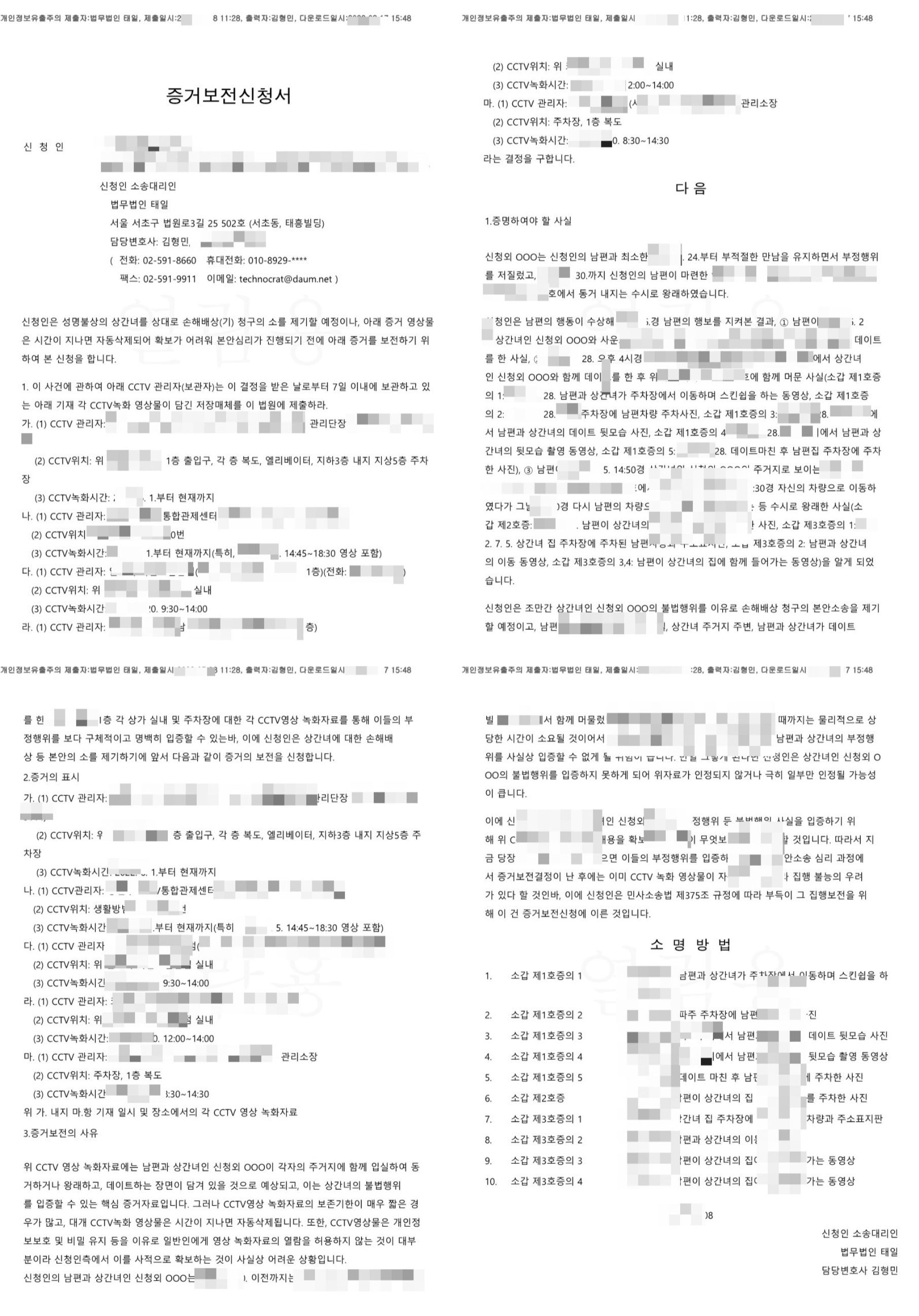 위 첫 번째 사례에서는 배우자와 상간자가 투숙한 호텔의 cctv를 확보하기 위한 증거보전신청입니다. 두 번째 사례는 증거의 범위가 다소 광범위합니다. 배우자가 부정행위를 하기 위하여 다른 이성과 속칭 데이트를 하였고 데이트 모습은 거리, 음식점 등 여러 곳에 설치된 cctv에 나와 있을 것으로 예상되어 그 영상을 확보하기 위한 증거보전신청을 하였습니다.
