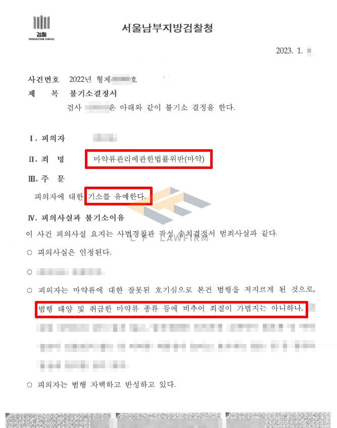 변호인으로서 의뢰인이 왜 인터넷을 통해 코카인이라는 마약을 접할 수밖에 없었는지, 이를 구매하여 사용 즉, 투약할 수밖에 없었는지 그 경위를 상세히 담은 변호인의견서를 작성하여 수사기관에 제출하였고, 이에 더하여 의뢰인의 양형자료 및 재범방지를 위한 자료들을 수집하여 수사기관에 추가로 제출하였으며, 이후 의뢰인의 선처를 구하기 위한 검사 면담 등을 진행하게 되었습니다.