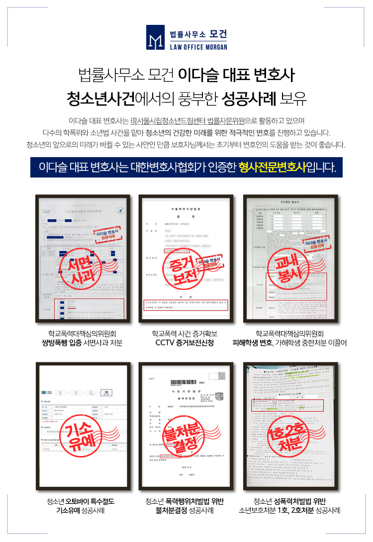 법률사무소 모건의 이다슬 대표 변호사는 형사전문변호사이자 서울시립청소년드림센터 법률자문위원으로 활동하며 학교폭력 사건과 청소년 범죄를 전담하고 있습니다. 아이들과 부모님들의 마음을 헤아리며 편안한 법률상담을 도와드리고 있으니 상담이 필요하신 분들은 법률사무소 모건으로 문의해주세요.