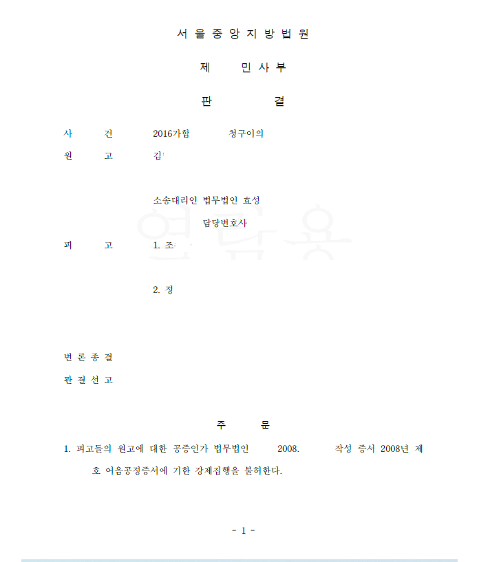 저는 즉각 청구이의의 소를 제기하여 이 사건 공증이 명의도용/위조 되었음을 주장 입증하였고 법원은 저희의 주장을 모두 받아들여 원고 전부 승소 판결을 선고하여 의뢰인은 공증에서 벗어날 수 있게 되었습니다.