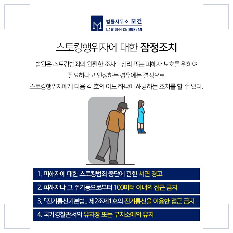 스토킹범죄는 피해자에게 상당한 정신적 고통과 불안감을 느끼게 하는 범죄행위인데다, 그 범죄행위가 점차 진화되어 강력범죄로까지 이어지는 경우까지 발생할 수 있습니다. 따라서 피해자 분들이라면 사안을 가볍게 여기지 마시고 반복적인 전화, 문자, 카톡이나 집이나 회사 근처에서 기다리는 행위 등도 스토킹범죄가 될 수 있는 만큼 형사전문변호사를 찾으셔서 잠정조치와 고소에 도움을 받으시기 바랍니다.