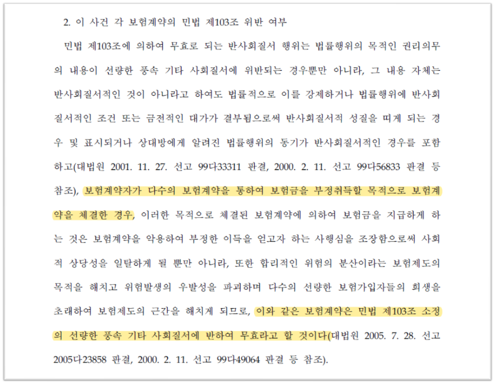 즉, 대법원은 보험계약자가 다수의 보험계약을 통하여 보험금을 부정취득할 목적으로 체결한 보험계약은 보험계약을 악용하여 부정한 이득을 얻고자 하는 사행심을 조장함으로써 사회적 상당성을 일탈하게 되고, 합리적인 위험의 분산이라는 보험제도의 목적을 해치며, 위험발생의 우발성을 파괴하여 다수의 선량한 보험가입자들의 희생을 초래하여 보험제도의 근간을 해치므로 민법 제103조에 따라 무효라 판단하고 있습니다.