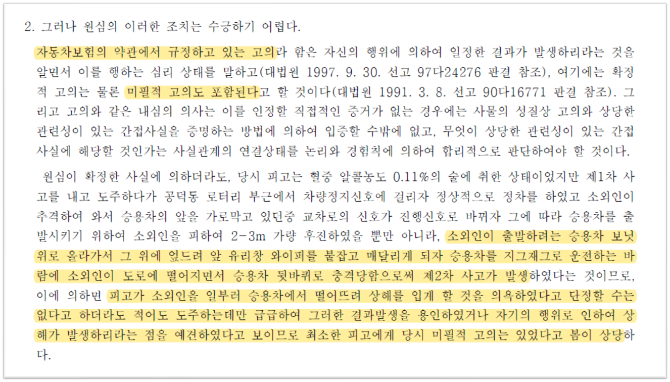 과거 대법원은, 출발하려는 승용차 보닛 위에 사람이 매달려 있는 상태에서 승용차를 지그재그로 운행하여 도로에 떨어뜨려 상해를 입게 한 경우, 운전자에게 상해 발생에 대한 미필적 고의가 있다고 하면서, 보험회사가 보험금을 지급할 의무가 없다고 판단한 바 있습니다.