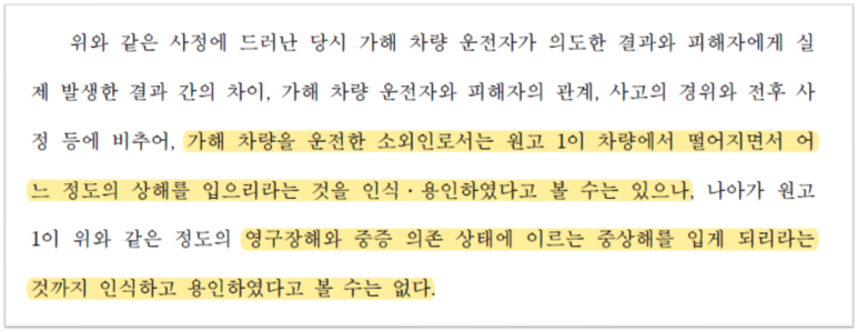 가해자는 직장동료들 간의 모임이 끝나고 헤어지려는데, 피해자가 ‘술 한 잔 더하자’며 가해자 차량 보닛 위에 올라타 장난을 했고, 자신도 장난삼아 자동차를 서서히 움직이다가 갑자기 제동하여 피해자를 보닛에서 굴러 떨어뜨렸습니다. 그런데 피해자는 이 사고로 하지부전마비 및 인지기능저하 등 노동능력상실률 44%의 영구장해 및 대소변, 식사 등 일상생활과 사회적 활동에 매일 성인 1인의 8시간 개호가 필요한 중증 의존 상태에 처하게 되었습니다.