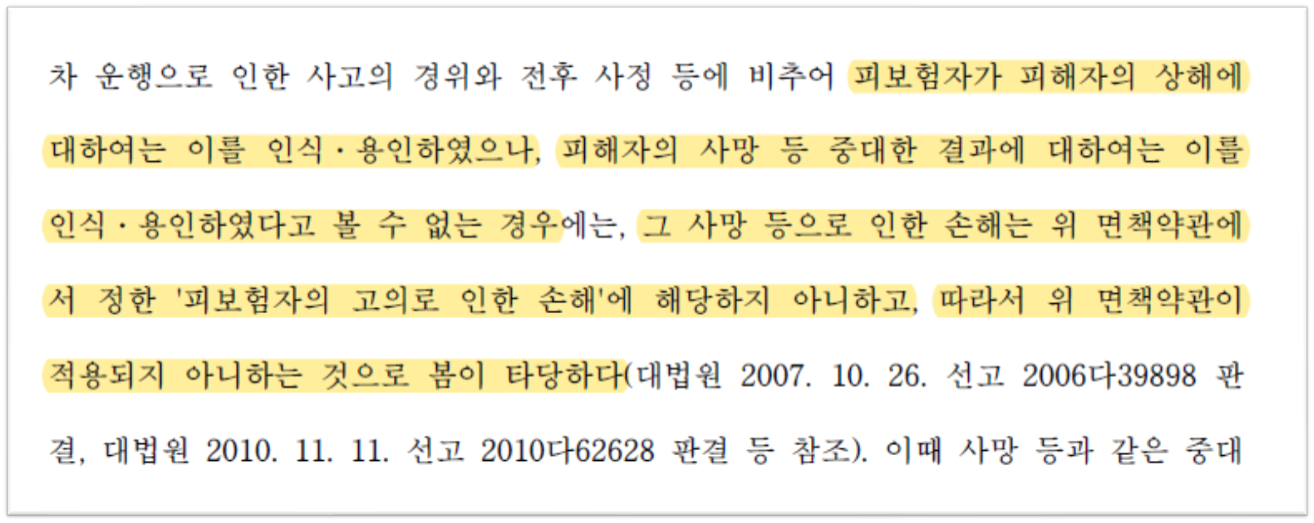 그러나 이번 사안에 대해 대법원은, 피보험자가 피해자의 상해에 대하여는 인식/용인하였으나, 피해자의 사망 중대한 결과에 대하여 인식/용인하였다고 볼 수 없는 경우 면책약관이 적용될 수 없다고 설명하면서, 가해자가 피해자에게 어느 정도 상해가 발생하리라는 점은 인식/용인하였다고 볼 수 있으나, 영구장해와 중증 의존 상태에 이르는 상해를 입게 되리라는 것까지 인식/용인하였다고 볼 수는 없다고 보아, 보험회사의 보험금 지급 의무를 인정하는 취지로 2심 법원의 판단을 파기·환송했습니다.