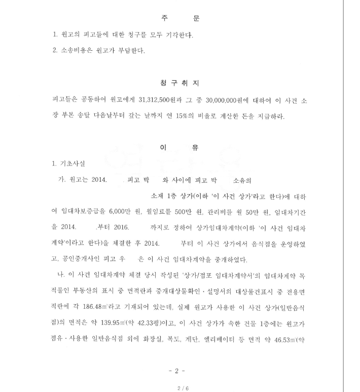 의뢰인은 상가 소유자로서 원고에게 상가를 임대차하였는데 원고는 계약서에 기재된 면적보다 실제 임차목적물의 면적이 적음을 이유로 의뢰인 및 공인중개사를 공동피고로 하여 부족한 면적분에 상응하는 차임 상당의 손해배상청구 내지 부당이득반환청구의 소송을 제기하였습니다.