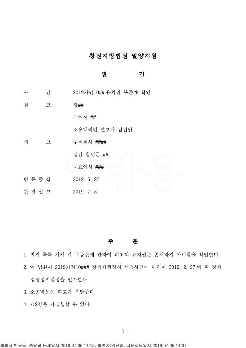 시공사가 유치권에 의한 경매를 진행했기 때문에 유치권부존재확인 소송을 제기함과 동시에 강제집행정지결정을 받아 경매절차를 우선 중단시켰습니다.