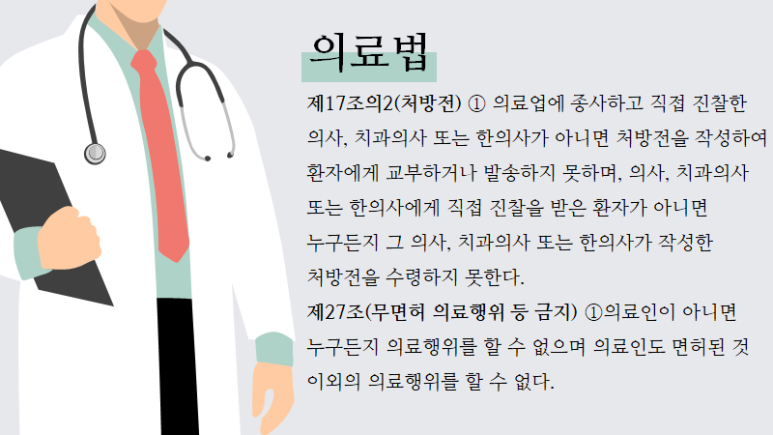 의료법은 직접 진찰한 의사가 아니면 처방전을 작성·교부할 수 없다고 규정하고 있습니다(의료법 제17조의2 제1항). 그리고, 의료인이 아니면 의료행위를 할 수 없을 뿐만 아니라 의료인이라도 면허된 것 이외의 의료행위는 할 수 없습니다(의료법 제27조 제1항).