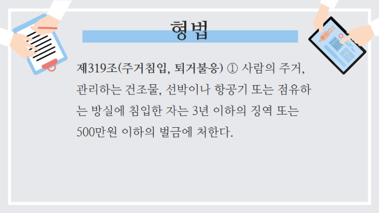형법은 사람이 주거, 관리하는 건조물 등에 침입한 자를 주거침입죄로 처벌하고 있습니다.
