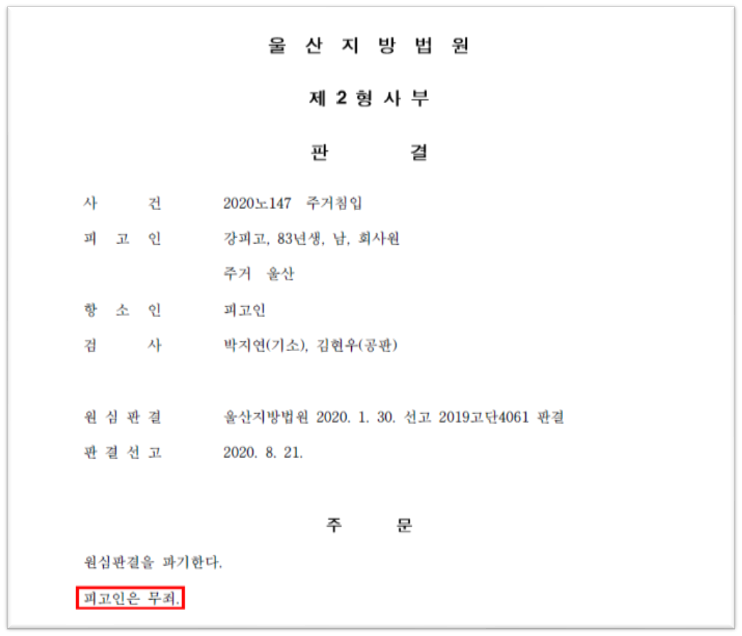 다만, 위 사건은 현재 검사가 상고하여 대법원의 판단을 기다리고 있는데, 그 판단에 따라 주거침입죄에 대한 법리에 상당한 변화가 있을 것으로 보입니다.
