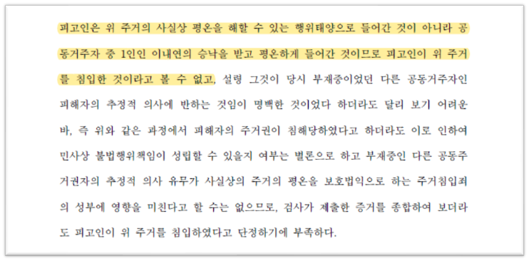즉, 하급심법원은 주거침입죄가 사실상 주거의 평온을 보호법익으로 한다는 대법원 판례를 따르면서도, 피고인이 공동 주거자 중 1인의 승낙을 받는 등 주거의 사실상 평온을 해할 수 있는 행위 태양으로 들어간 것이 아니라면 주거를 침입하였다고 할 수 없고, 이는 당시 부재중이었던 다른 공동거주자인 피해자의 추정적 의사에 반하는 것임이 명백한 것이었다 하더라도 달리 보기 어렵다며 무죄를 선고했습니다.