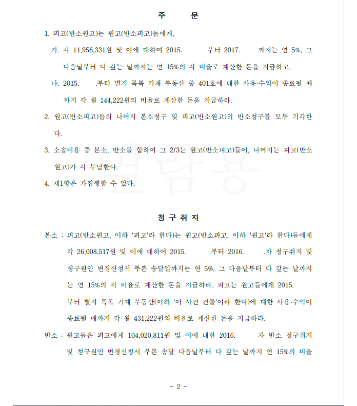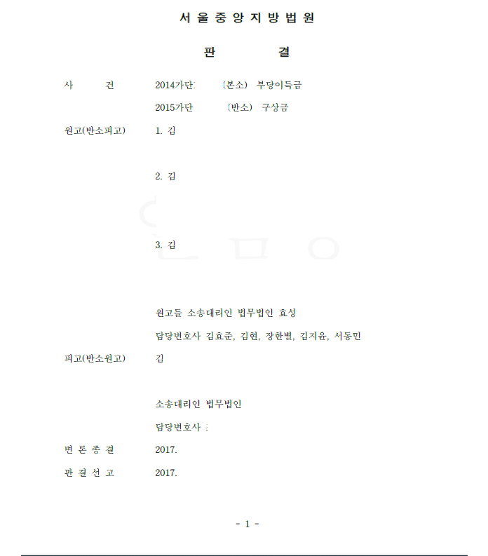 저는 의뢰를 받고 즉시 부당이득반환청구소송을 하였고 피고가 독식한 임대료 및 피고가 내지 않는 임대료 액수를 계산하여 청구하였습니다. 피고는 소송 중 반소로서 원고들에게 수도료 등 약 1억 원을 내놓으라고 청구하였으나 법원은 저희의 주장을 받아들여 원고 승소 판결을 선고하였고 피고의 반소는 기각하였습니다. 결국 의뢰인들은 피고로부터 임대료 등 금원을 지급받았습니다.