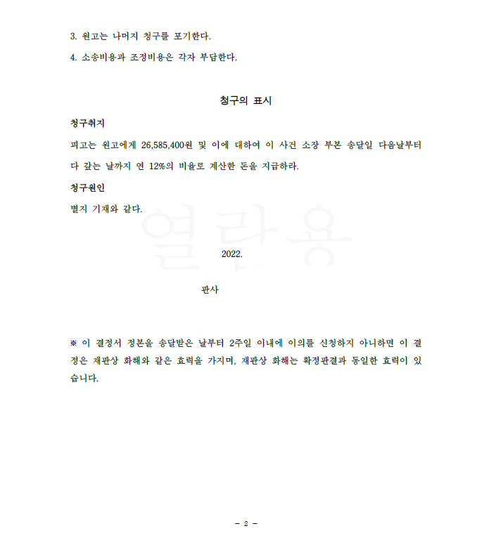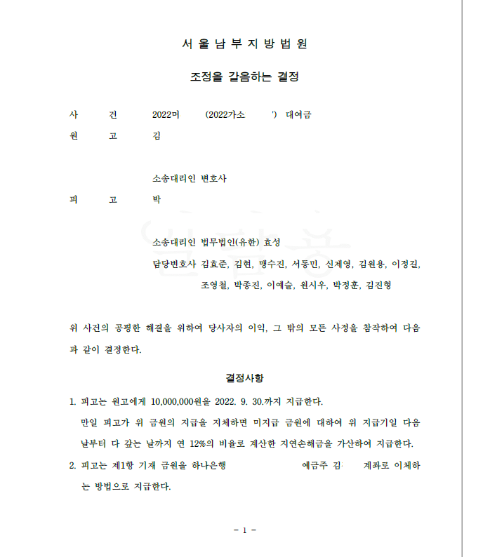 저는 답변서 등에서 이 사건의 경위, 금전지급경위 등을 볼 때 이 사건 금원은 대여가 아니라 증여이며 원고가 지급한 금원 중 일부만이 대여라고 주장 입증하였습니다. 법원은 저희의 입장을 받아들여 의뢰인이 원고에게 실제로 차용한 금전만을 지급하는 것으로 강제조정을 내려 확정되었습니다.