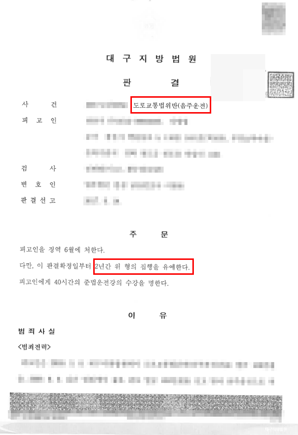 2차례 음주운전한 전력에 높은 혈중알코올농도 수치로 징역형 선고가 예상되었으나, 제출한 양형사유가 정상참작되어 집행유예를 받아낸 성공사례