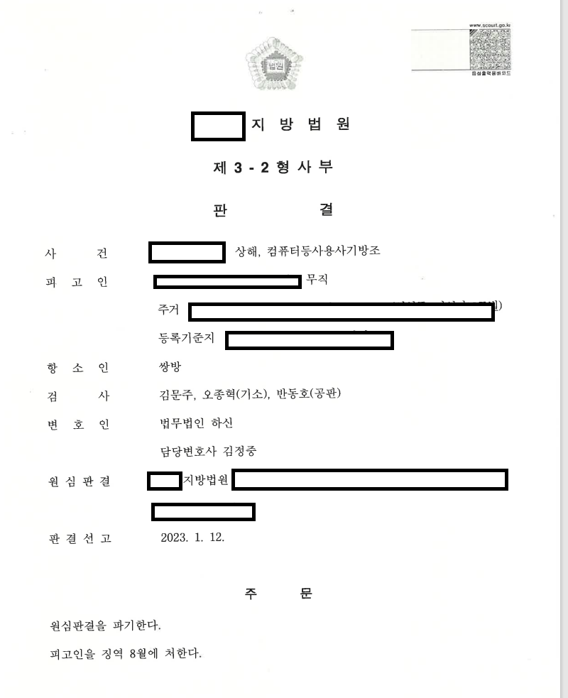본 사안은 보이스피싱 사건으로 1심에서 실형 1년 6개월 선고를 받은 의뢰인이었습니다.