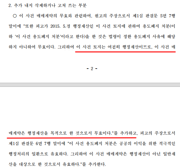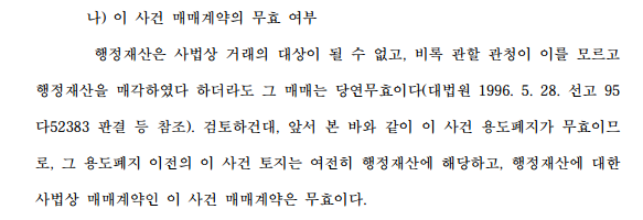 이에 대해 저는 '공유재산의 매매행위는 무효'라는 공유재산법의 법리를 떠올렸습니다. 저는 항소심에서 위 관광지는 공유재산이므로 그 매매가 무효라는 법리를 추가로 주장하였고, 항소심법원은 이를 그대로 받아들여 상대방 지자체의 청구를 기각하였습니다. 상대방 지자체는 위 법리를 반박할 방법이 없다고 판단하였는지 상고를 하지 않아 그대로 사건이 확정되었습니다.
