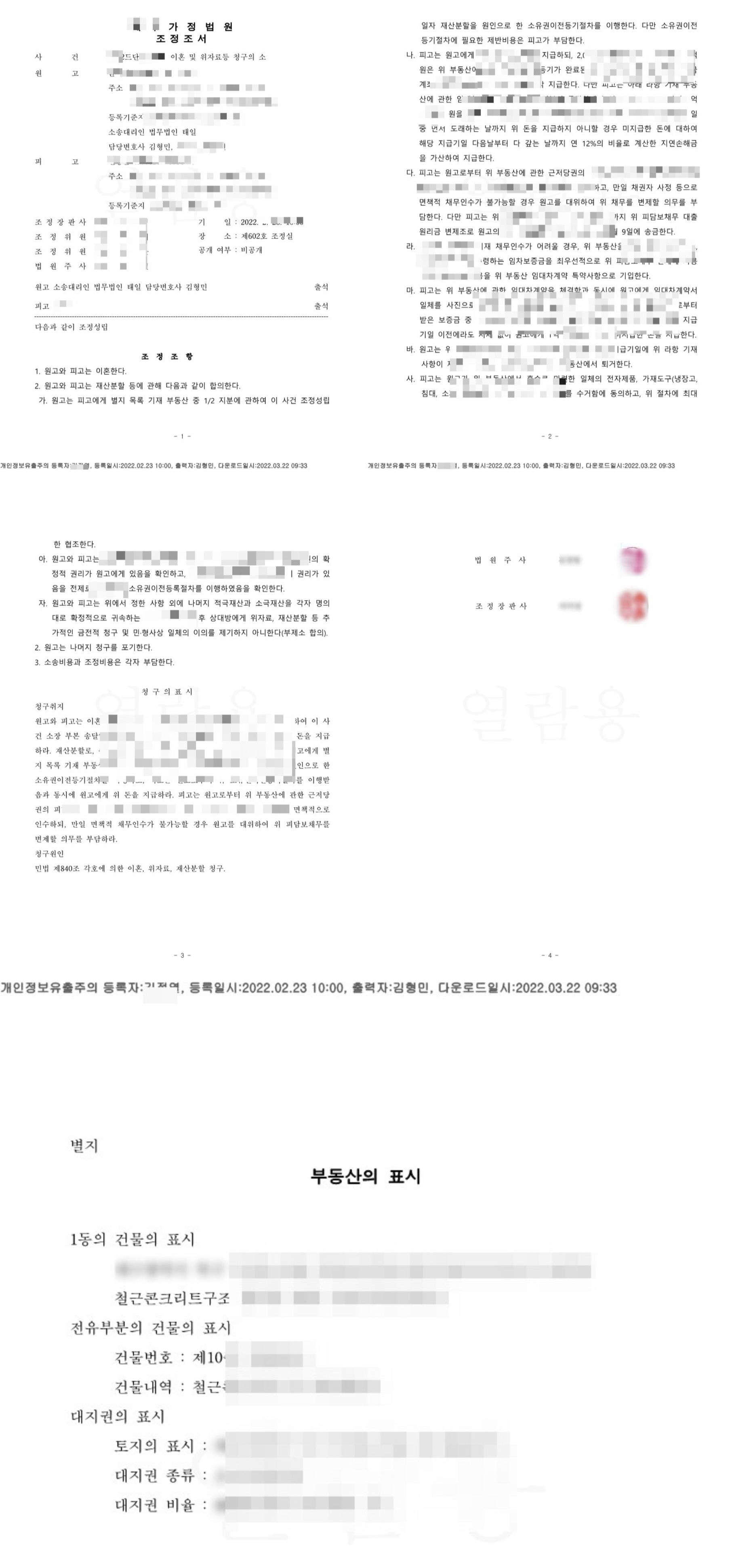 위 조정조서는 제가 직접 수행하고 조정으로 마무리한 사건입니다. 설명드렸듯이 재판상 이혼 소장으로 접수하여 의뢰인과 상대방이 서로 조정으로 마무리 하는 것으로 합의되어 조정기일이 지정되었습니다. 조정기일에서는 조정담당판사와 조정위원이 당사자 간의 이행 사항을 확인하고 동의를 받았습니다. 조정으로 진행하면 재산분할과 관련하여 적극재산과 소극재산의 형성과정과 기여도를 복잡하게 설명하지 않아도 되고 이러한 증거를 확보한다고 사실조회신청, 문서송부촉탁 등 각종 증거절차를 거치지 않아도 됩니다. 또 혼인파탄 원인 제공자에 대한 위자료를 청구하기 위해 사생활을 낱낱이 주장할 필요도 없습니다.
