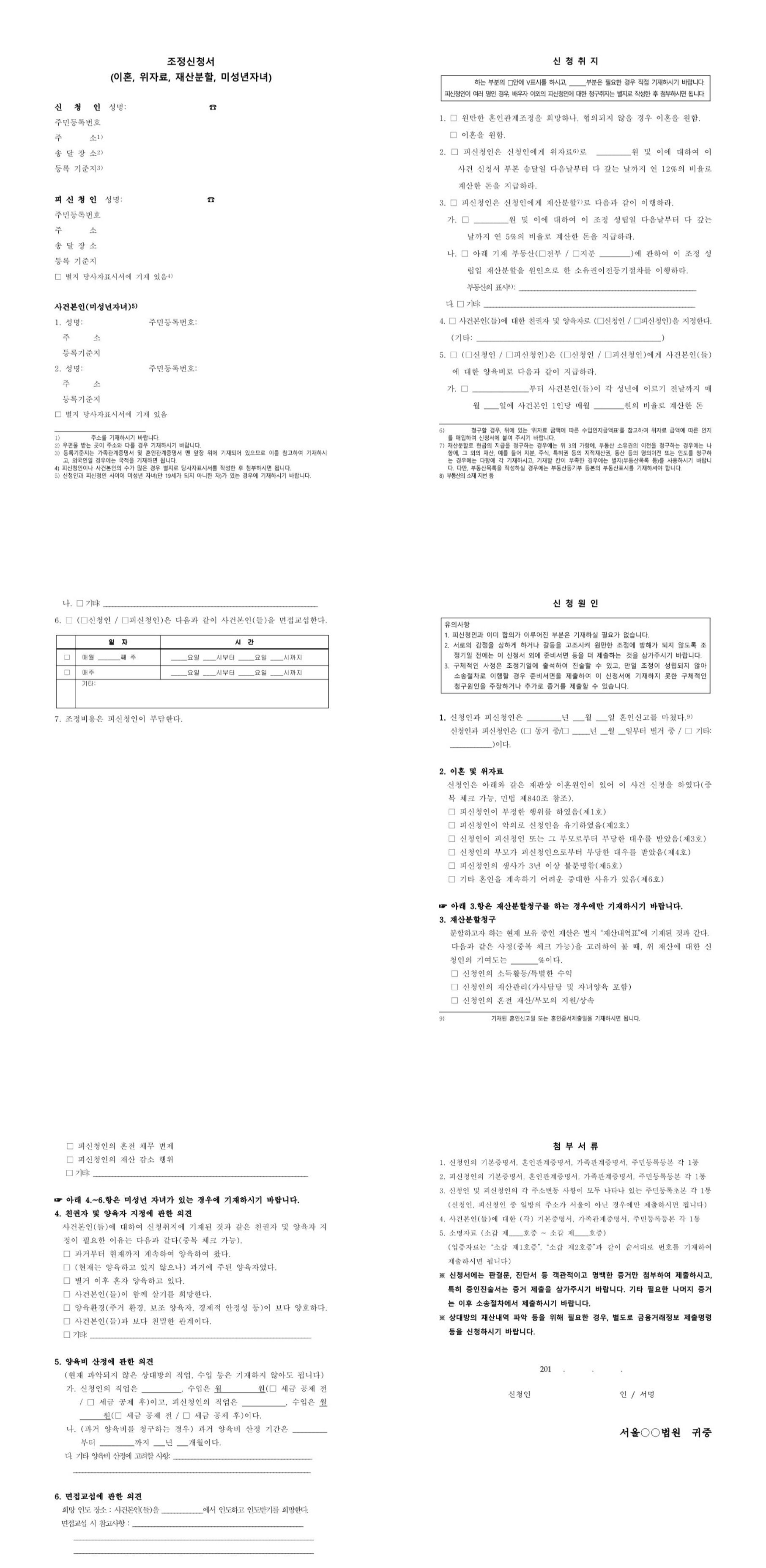 당사자가 이혼조정만을 구하는 이혼조정신청서입니다. 재판상 이혼의 경우 청구하는 자가 원고이고 상대방이 피고인데, 조정이혼의 경우 신청인과 피신청인이라고 부릅니다.