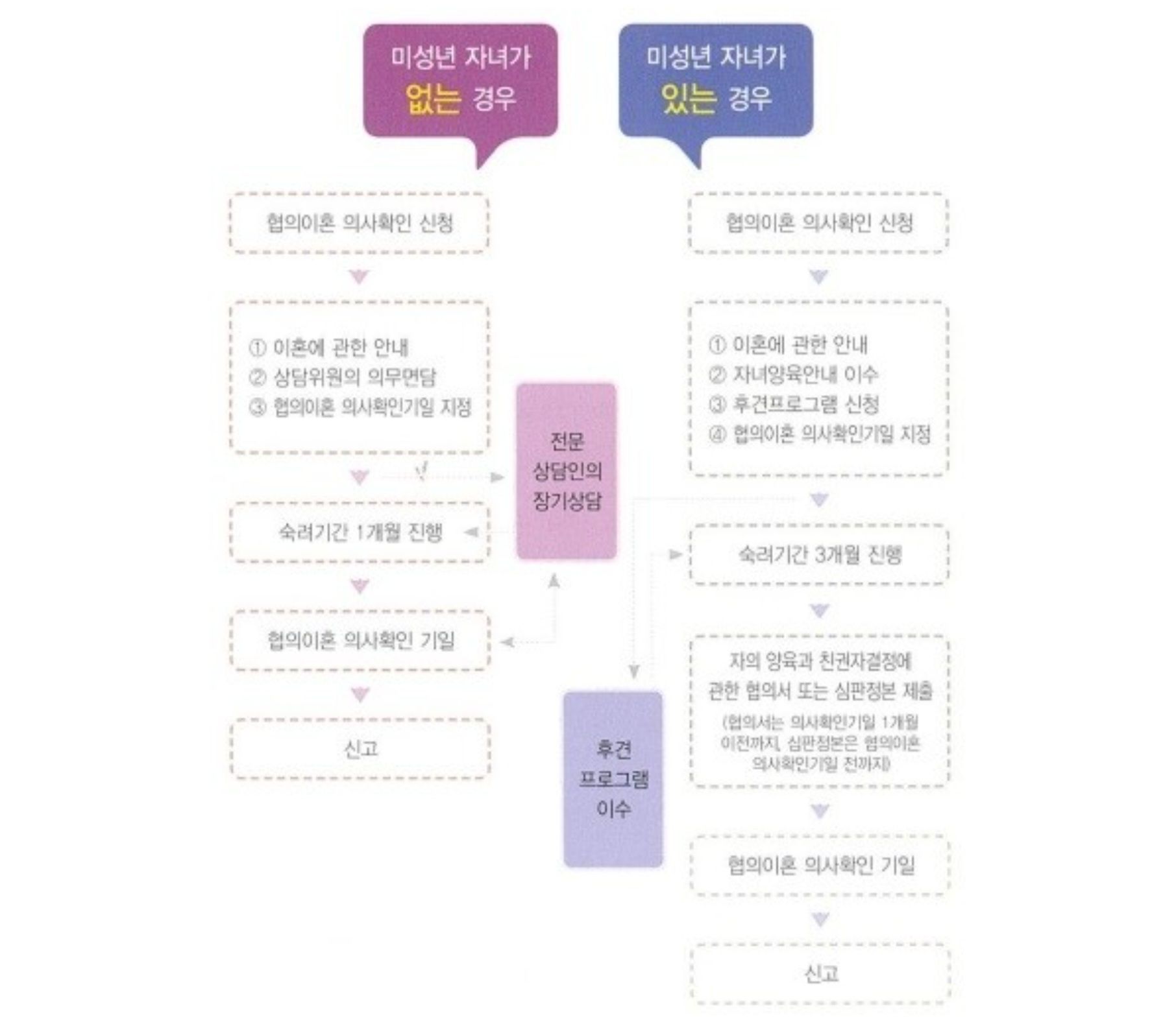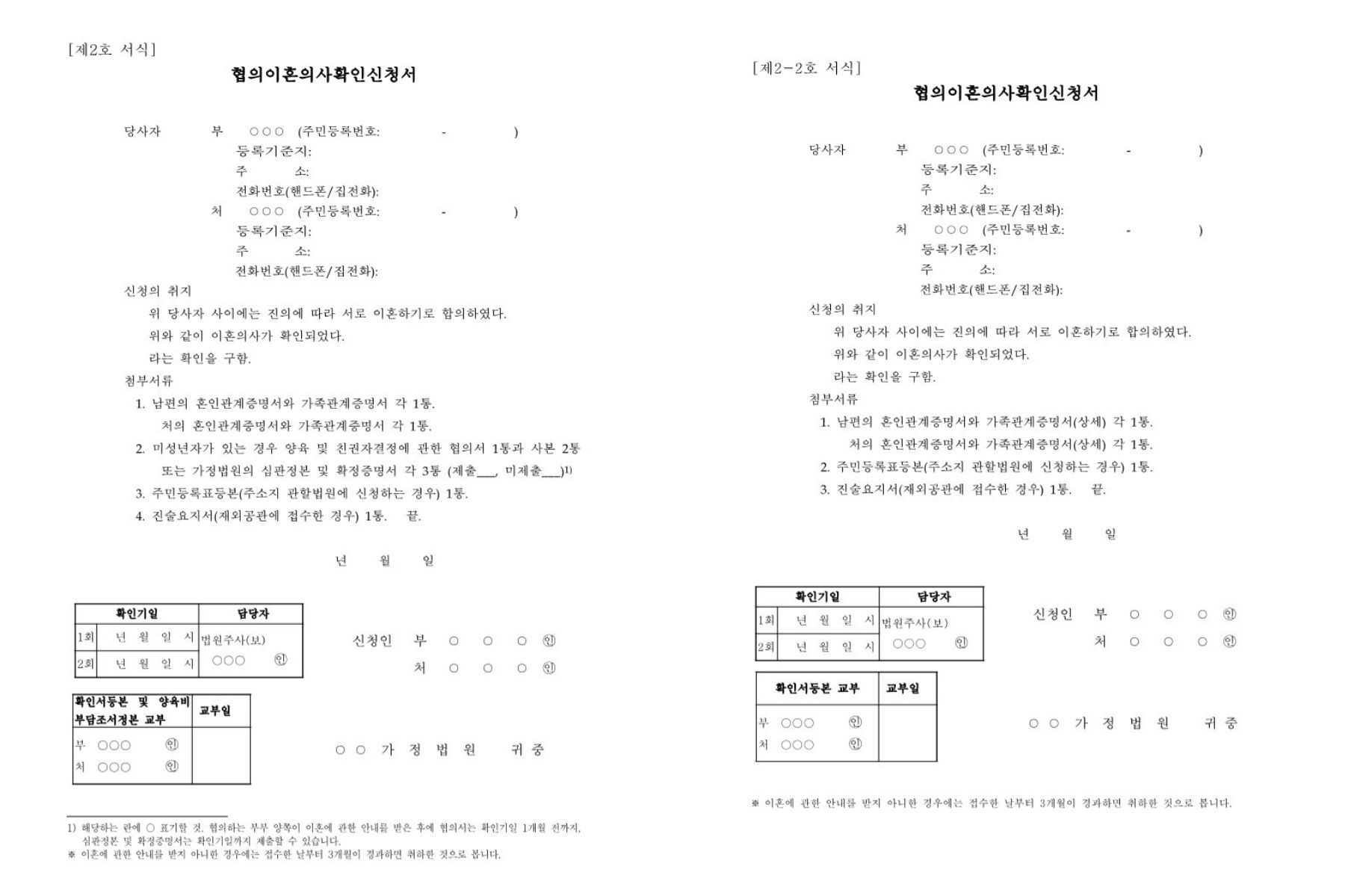 위 표를 보시면 협의상 이혼이 어떻게 진행되는지 한 눈에 파악하실 수 있습니다. 협의이혼의사확인신청서도 부부사이에 미성년의 자녀가 있는 경우와 없는 경우로 나누어져 있습니다.