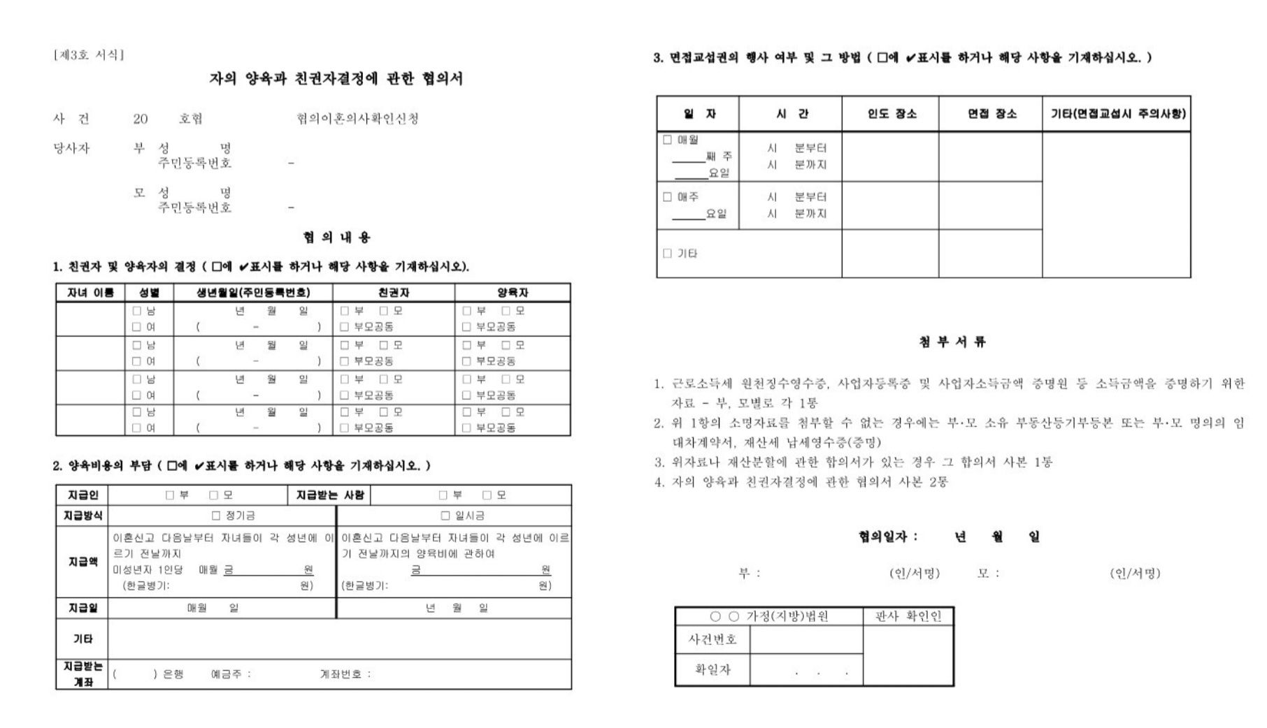 이혼을 신청하는 양식입니다. 미성년 자녀가 있는 경우에는 협의상 이혼 확인서 등본 외에 "양육비부담조서정본"이 필수적으로 부가됨을 확인할 수 있습니다. 또한 자의 양육과 친권자결정에 관한 협의서에는 “친권자 및 양육자결정”, “양육비용의 부담”, “면접교섭권의 행사 여부 및 그 방법”에 관한 사항을 반드시 협의하여 기재하게 되어 있습니다.