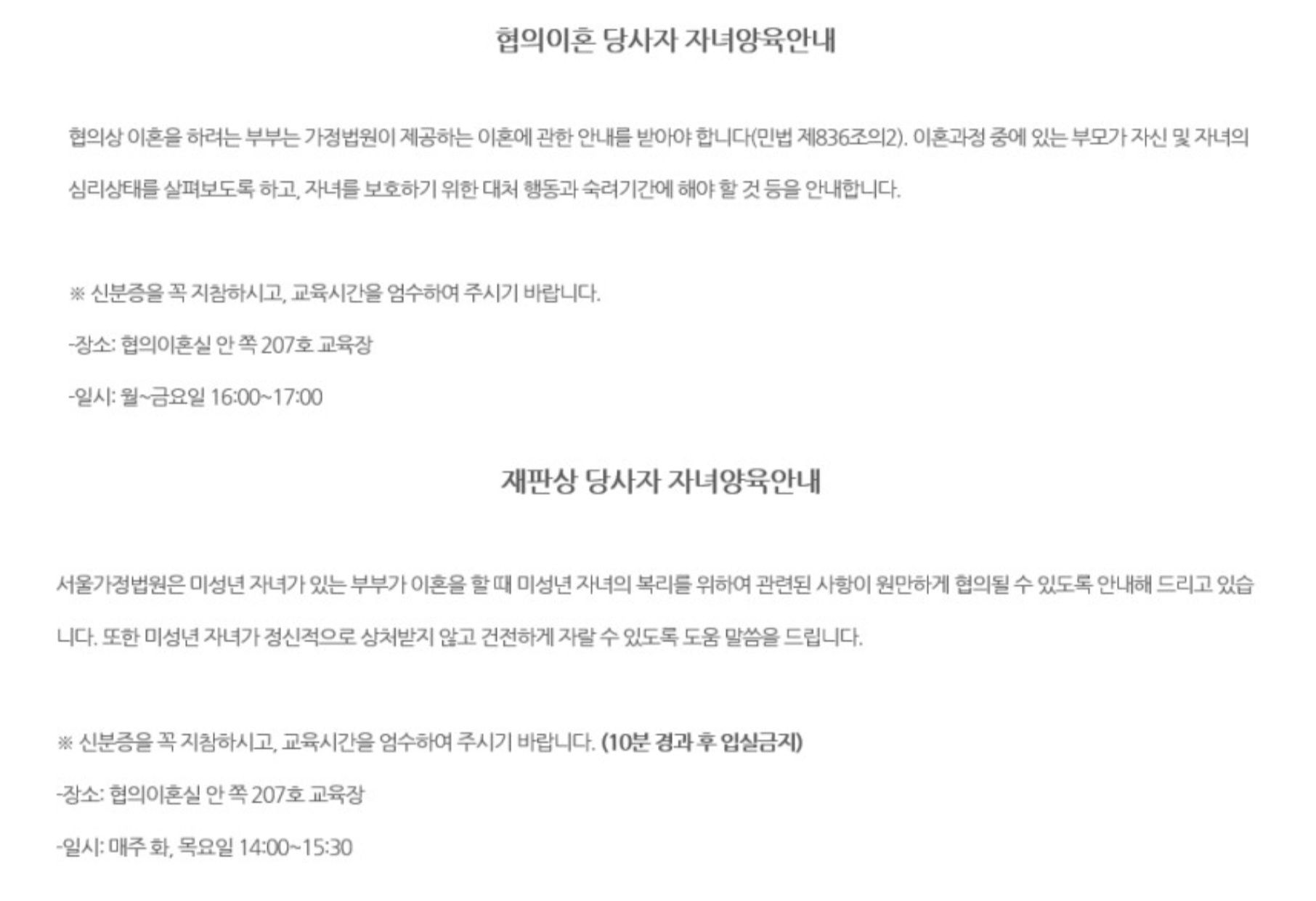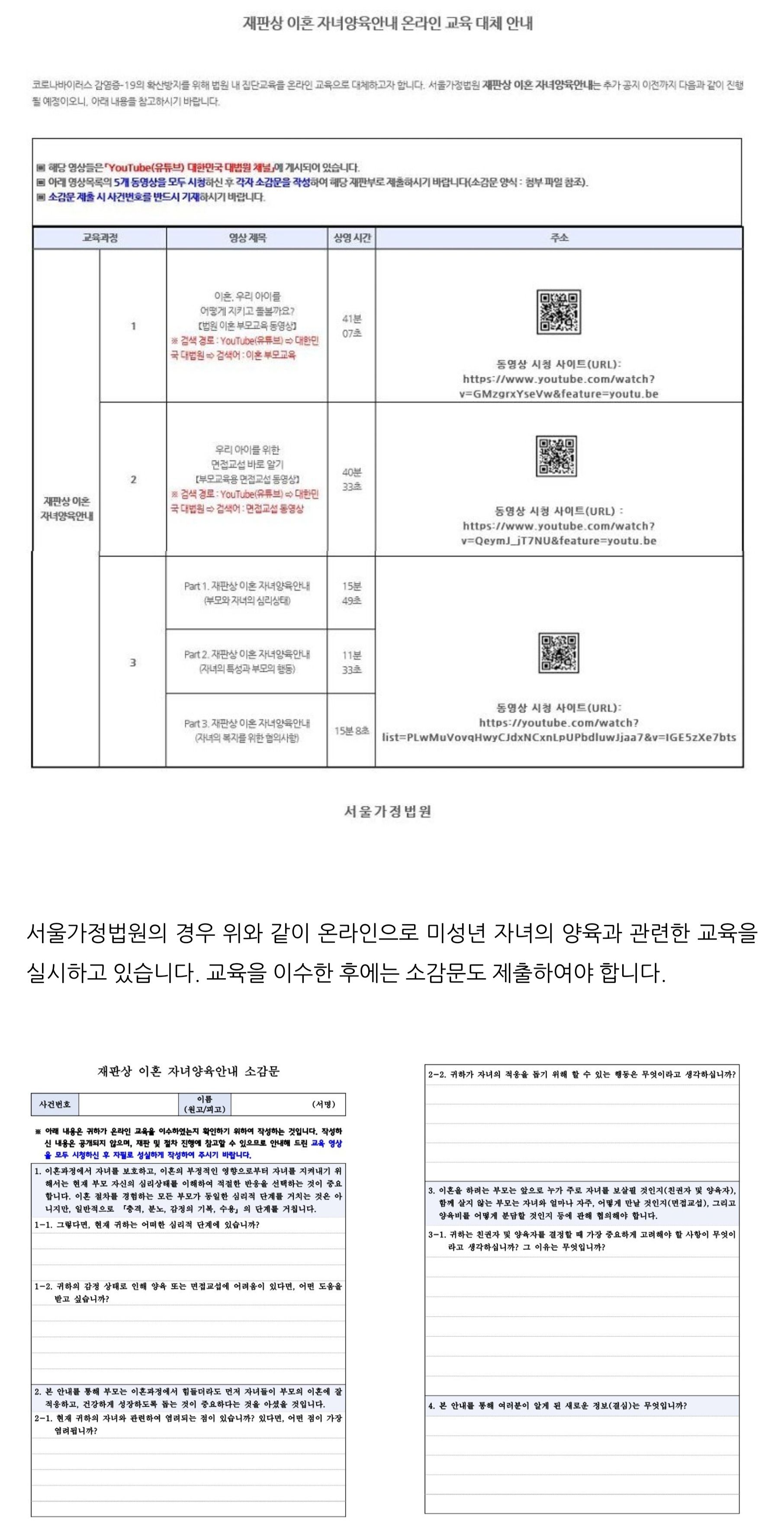 위와 같이 코로나19 발생 이전에는 법원을 직접 방문하여 미성년 자녀의 양육과 관련한 교육을 필수적으로 받아야 했습니다. 당사자 사이에 이혼과 관련하여 미성년 자녀의 양육과 보호를 우선하였음을 알 수 있습니다. 재판상 이혼의 경우에는 미성년 자녀의 양육 및 친권자가 판결선고(또는 조정 등) 이전에는 결정되지 않은 상태입니다. 자녀양육안내 교육과 관련한 안내는 통상적으로 송달 형식으로 당사자에게 안내문을 보내주고 있습니다. 변호사인 대리인에게 보내주지 않습니다. 가정법원은 코로나19로 인하여 대면 접촉이 제한된 현재의 상황에서는 온라인 교육으로 대체하고 있습니다.