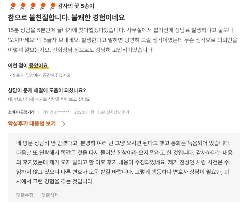 저에게만 보이는 감사의 꽃은 왜 5송이이고 '의뢰인 입장에서 공감해주셨어요.', '네, 변호사님께 추가로 상담을 받아보고 싶어요'라고 그대로 되어 있는지 궁금했는데 아마도 본문 내용은 추후 수정이 가능한데 꽃송이와 저 내용은 추후 수정이 안 되기 때문이 아닐까 싶습니다. 이런 내용을 보면 그냥 재밌다는 생각 정도가 듭니다.