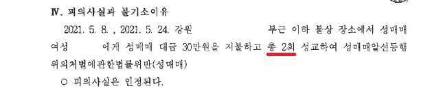 대위 A씨는 2021. 5. 8.경과 2021. 5. 24.경에 랜덤 채팅 어플리케이션에서 알게 된 성매매 여성 B씨와 군부대 인근에서 만나 합계 30만 원을 지불하고 총 2회 성매매를 하였습니다.