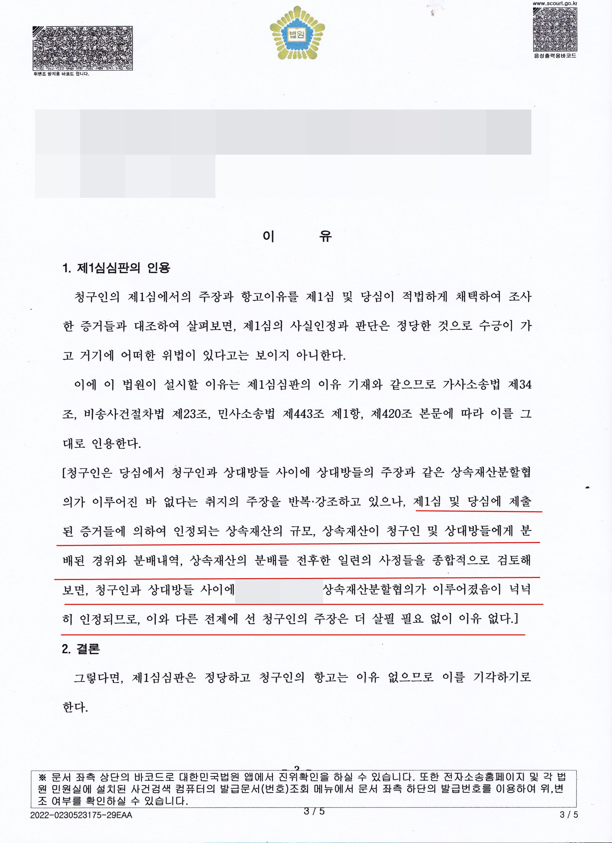 나. 기여분이나 특별수익으로 상속분재조정의 필요가 없는 경우 가분채권에 관하여는 상속재산분할이 안 됨. 청구인은 단순 부양을 원인으로 억지의 기여분을 주장하며 가분채권에 관하여 분할심판을 한 상황. 이에 상대방들은 청구인에게 특별수익이 있어 가분채권에 대한 분할은 가능하며 상대방들에게 유리하게 재조정이 되어야 한다며 청구인의 특별수익을 주장하고 구체적인 입증활동을 하였음, 그런데, 변론도중 상대방들의 얘기를 듣다보니, 이미 부동산에 대해 서면상의 상속재산분할협의가 있었고, 이후 다시 가분채권에 관해서도 구두상의 상속재산분할협의가 있었던 사실이 확인되어 증거를 확보하여 각하주장으로 초점을 맞춤.