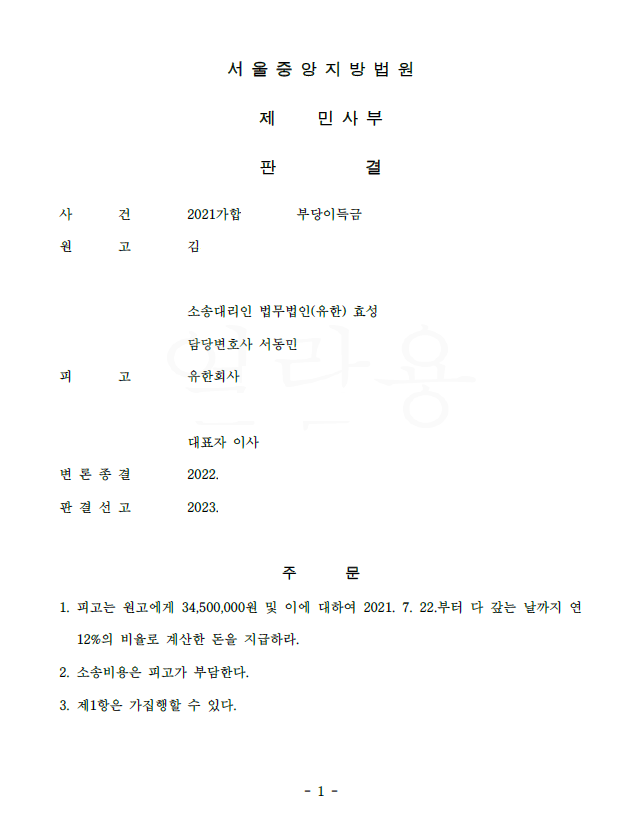 저는 즉각 입금 받은 자를 피고로 하여 민사소송 부당이득반환청구소송을 제기하였고 법원은 저희의 주장을 모두 받아들여 전부 승소 판결을 선고하여 의뢰인은 피해액을 돌려받게 되었습니다.