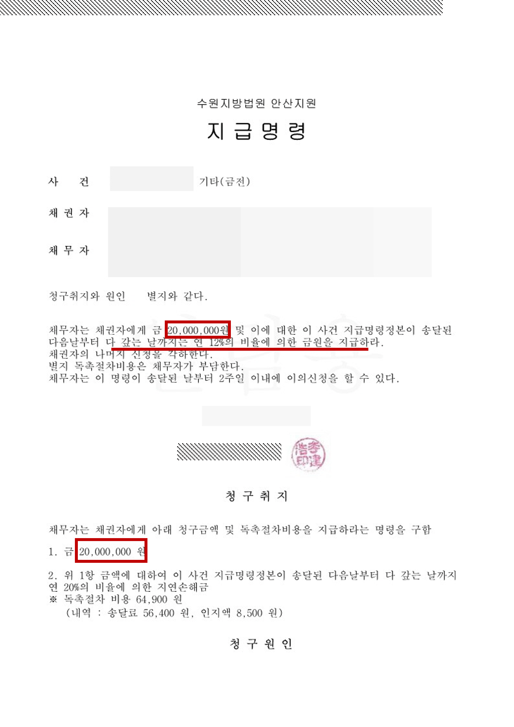 지급명령신청은 청구금액의 많고 적음과는 관계없이 신청서를 제출하여 금원을 받는 방법입니다.