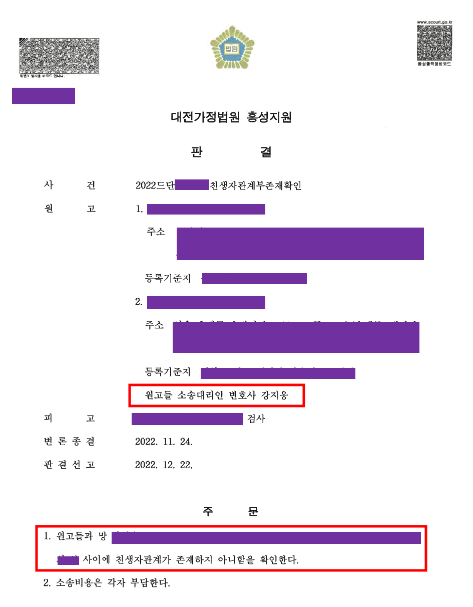 그 결과 ‘A(A의 동생)와 사망한 법률상 모친 사이에 친생자관계가 존재하지 않음을 확인한다’는 내용의 인용판결을 받을 수 있었습니다.